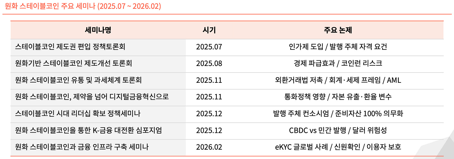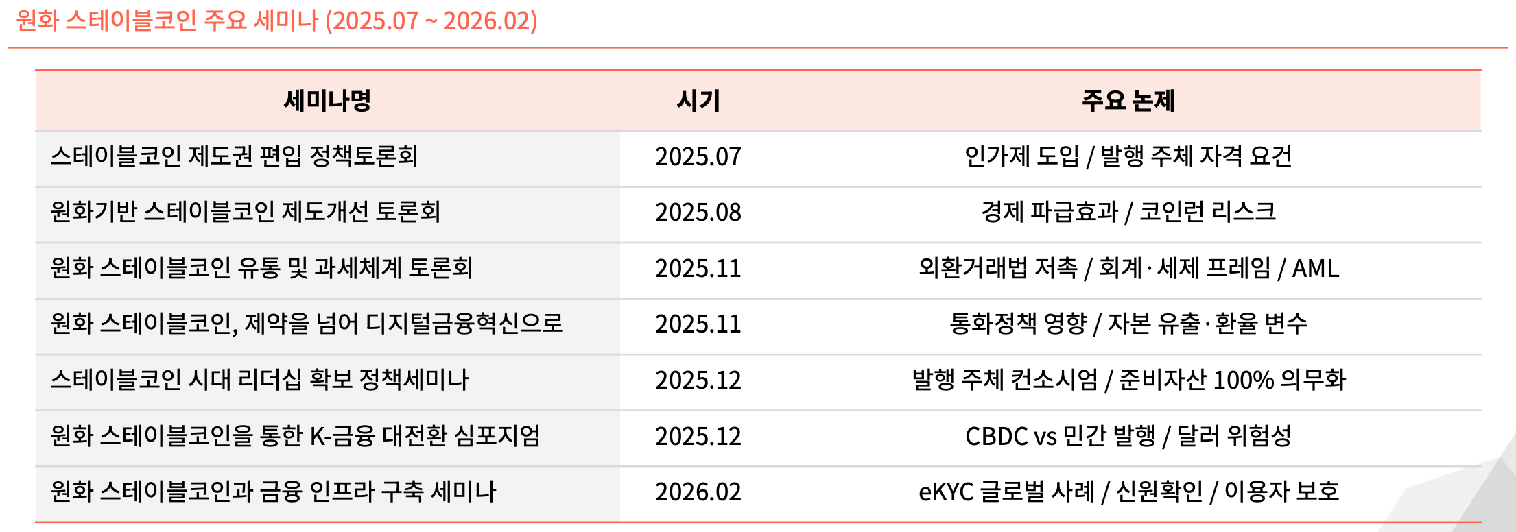 2025년 7월부터 2026년 2월까지 국회와 학계에서 7차례 이상의 주요 토론회가 열렸고, 논의의 중심은 발행 주체, 준비자산 요건, 감독 권한이었다.