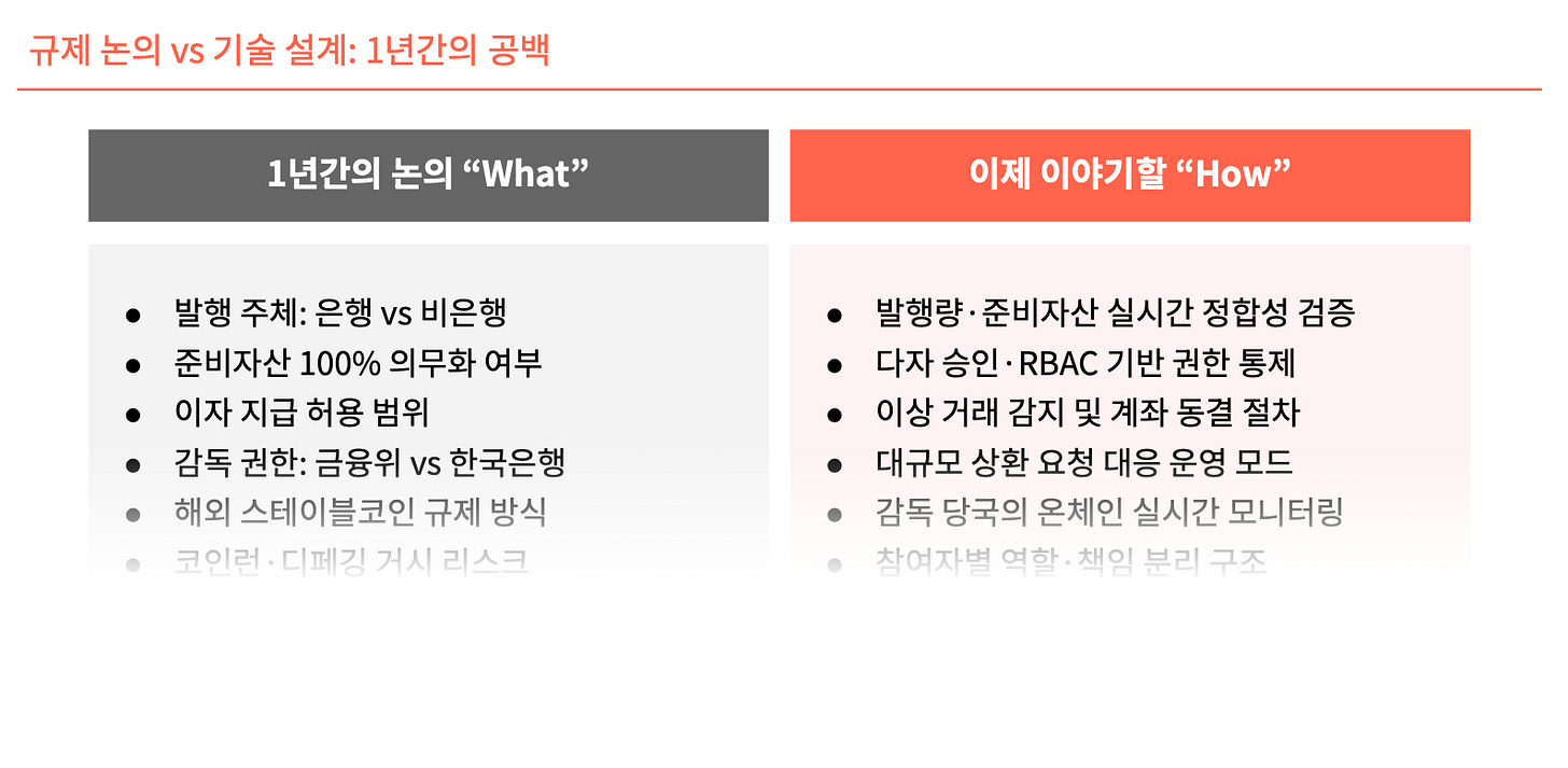 지난 1년간 원화 스테이블코인 논의는 발행 주체나 준비자산 요건, 감독 권한 등 규제적 방향성(”What”)에만 머물러 있었습니다. 이제는 규제의 언어를 실제 작동 가능한 기술 구조(”How”)로 번역해야 하며, 누가 출발할지가 아니라 어떻게 달릴지를 이야기해야 할 때입니다.