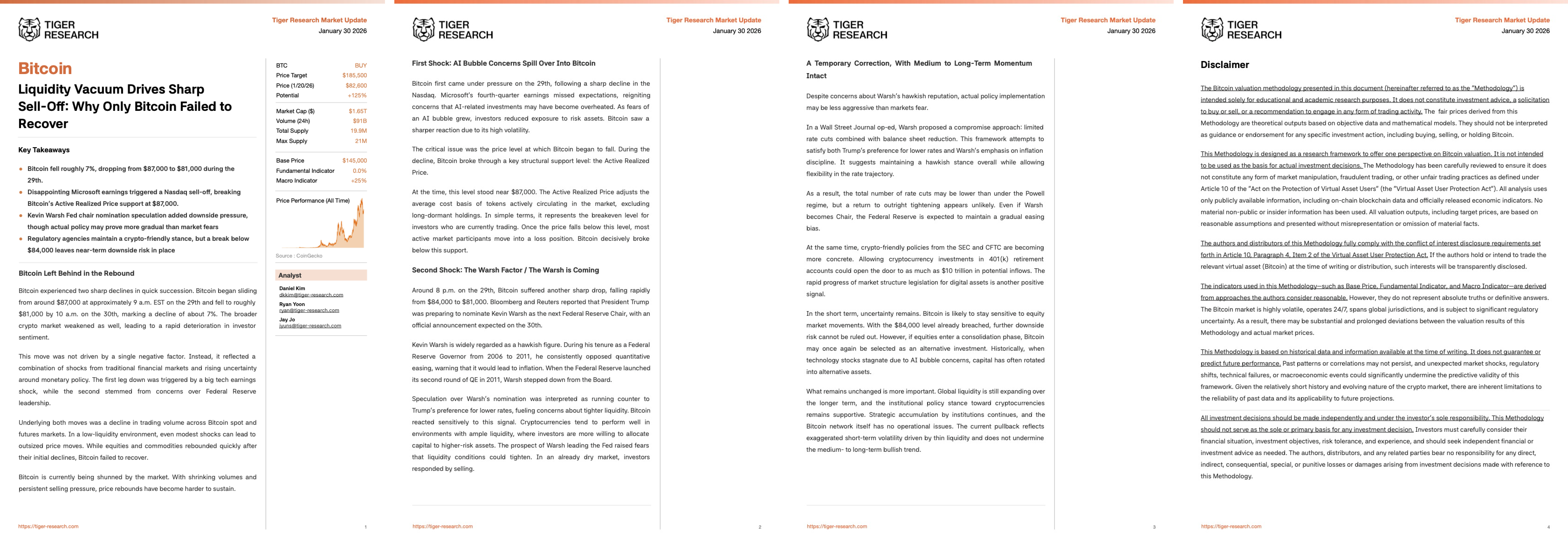 This move was not driven by a single negative factor. Instead, it reflected a combination of shocks from traditional financial markets and rising uncertainty around monetary policy. The first leg down was triggered by a big tech earnings shock, while the second stemmed from concerns over Federal Reserve leadership.
