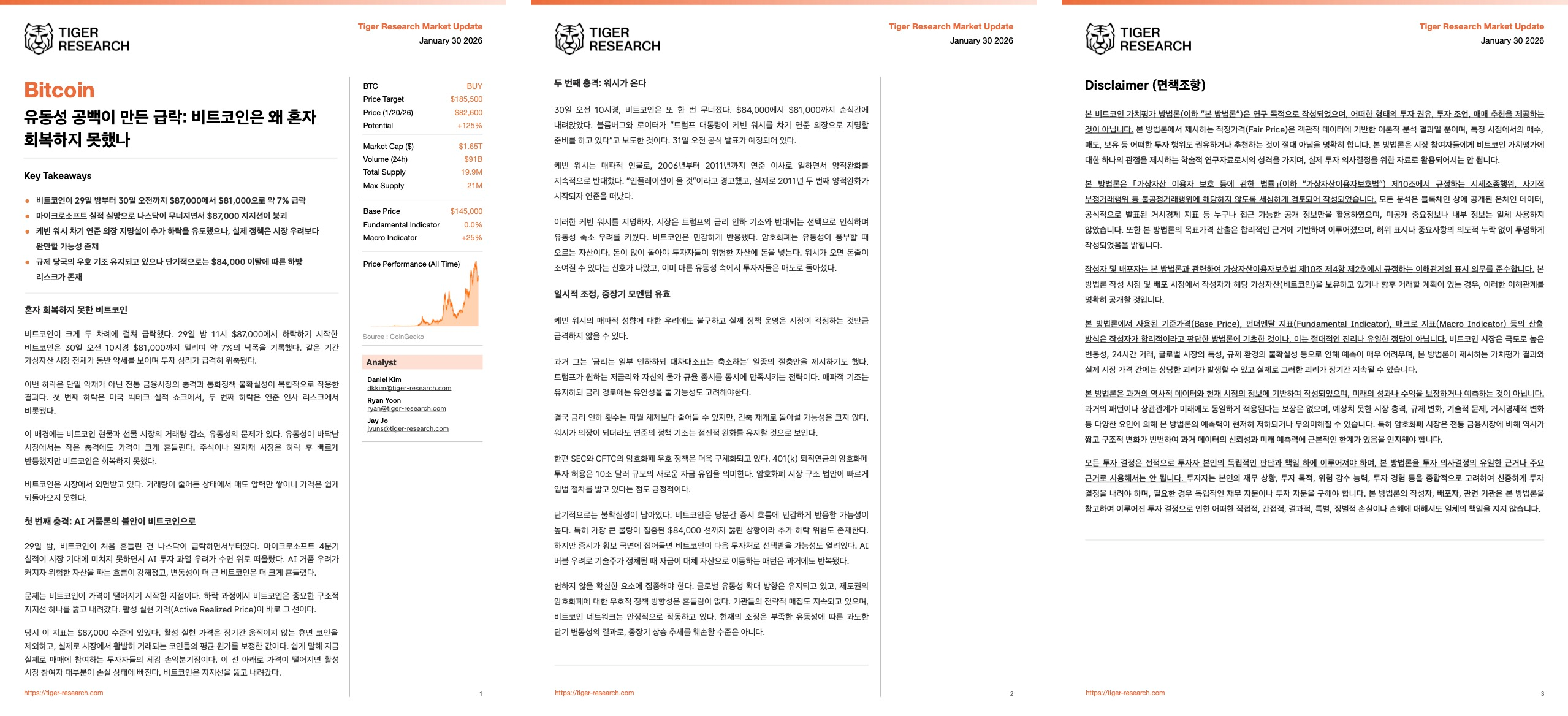 미국 정부의 암호화폐 우호 정책은 유지, 중장기 상승 흐름은 여전히 유효하나 단기적으로는 $84,000 이탈에 따른 하방 리스크가 존재