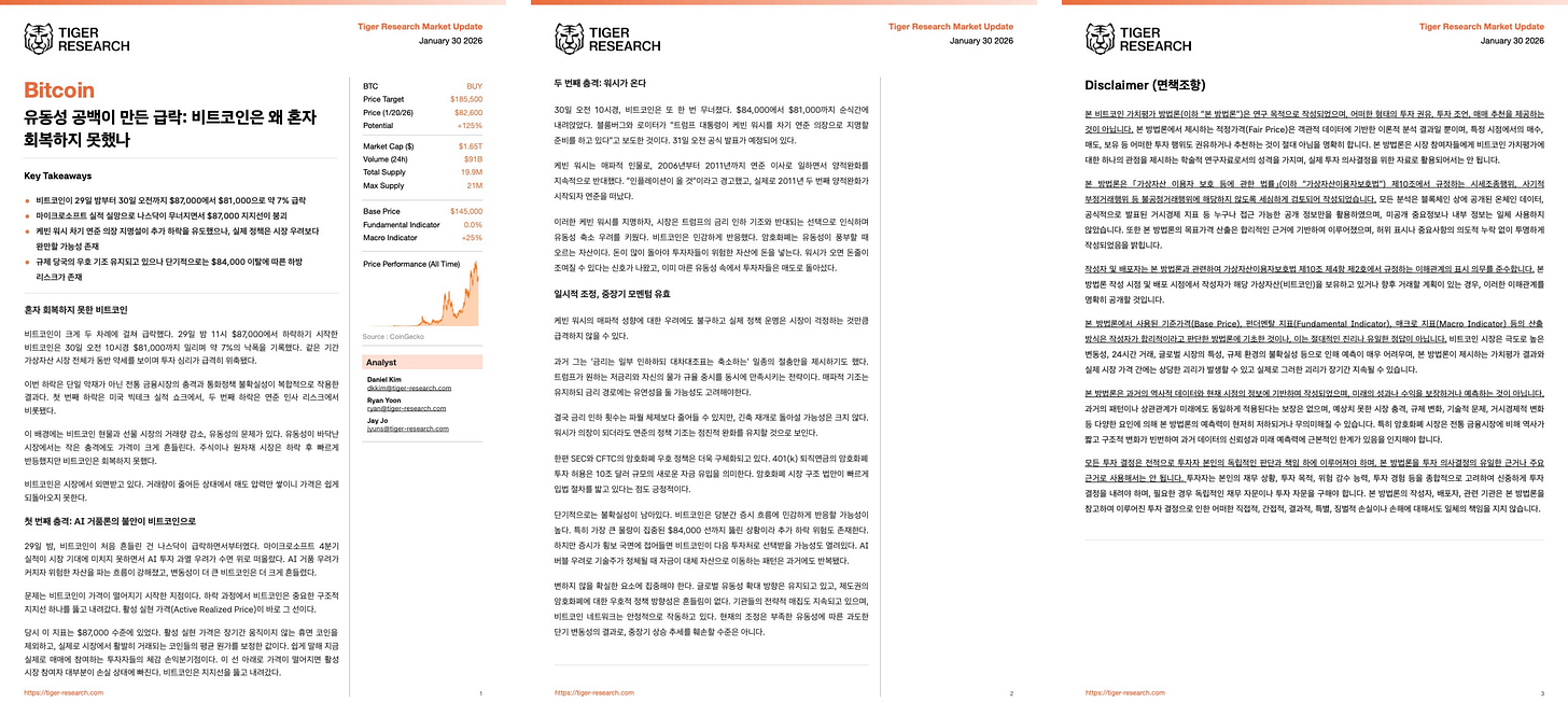 이번 하락은 단일 악재가 아닌 전통 금융시장의 충격과 통화정책 불확실성이 복합적으로 작용한 결과다. 첫 번째 하락은 미국 빅테크 실적 쇼크에서, 두 번째 하락은 연준 인사 리스크에서 비롯됐다.