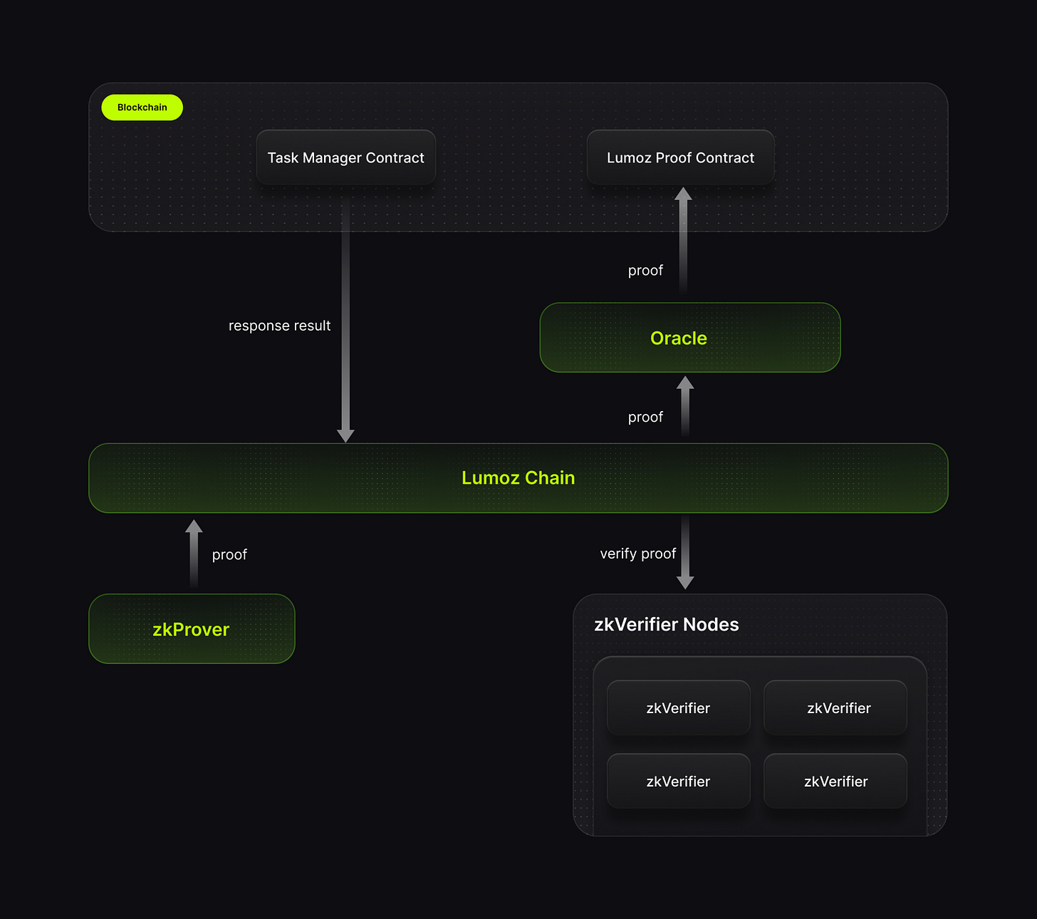 Lumoz uses a hybrid structure to manage the generation and verification of ZKPs. At its core are two components: zkProver, which generates ZKPs, and zkVerifier, which verifies them.