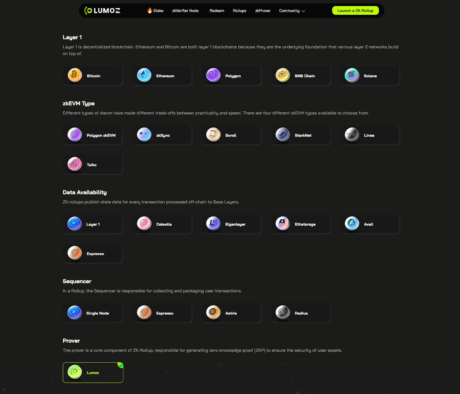 Lumos' Rollup Launchbase supports major chains like Bitcoin, Ethereum, BNB Chain, Polygon, and Solana. It also supports zkEVM types such as Polygon zkEVM, zkSync, and Scroll. This wide support makes building ZK-Rollup solutions easier for developers.