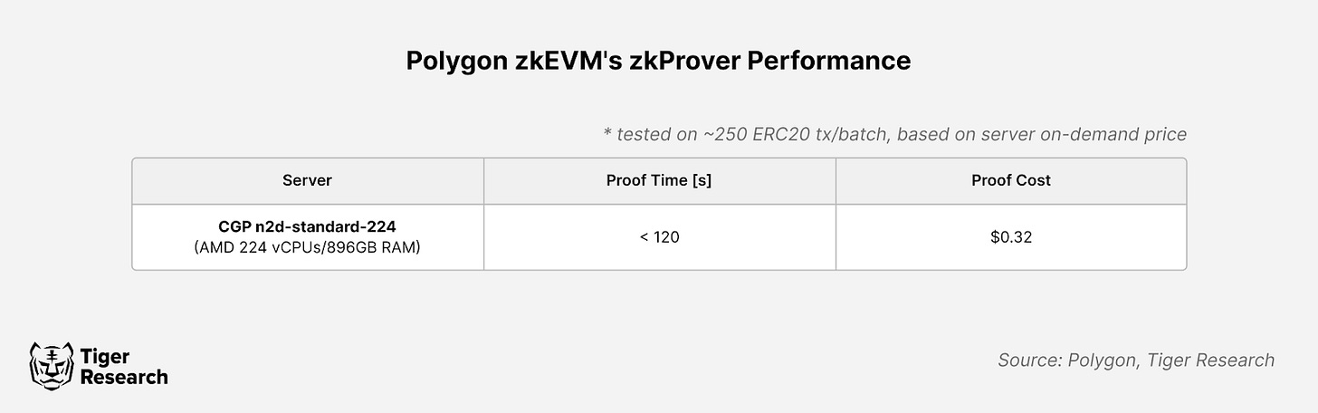 These high-performance computing requirements are especially evident in layer 2 scaling solutions like ZK-Rollups. For instance, generating a ZKP for a batch of 250 ERC-20 transactions on Polygon zkEVM takes about 2 minutes using a server with AMD 224 vCPUs and 896 GB RAM. The operational cost is approximately $0.32 for 2 minutes or $6,909 monthly. In contrast, a typical web server requires only 4 vCPUs and 8 GB RAM.