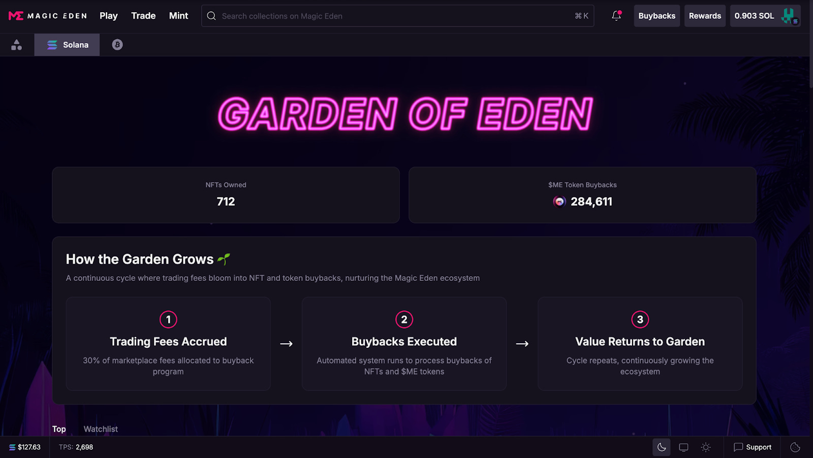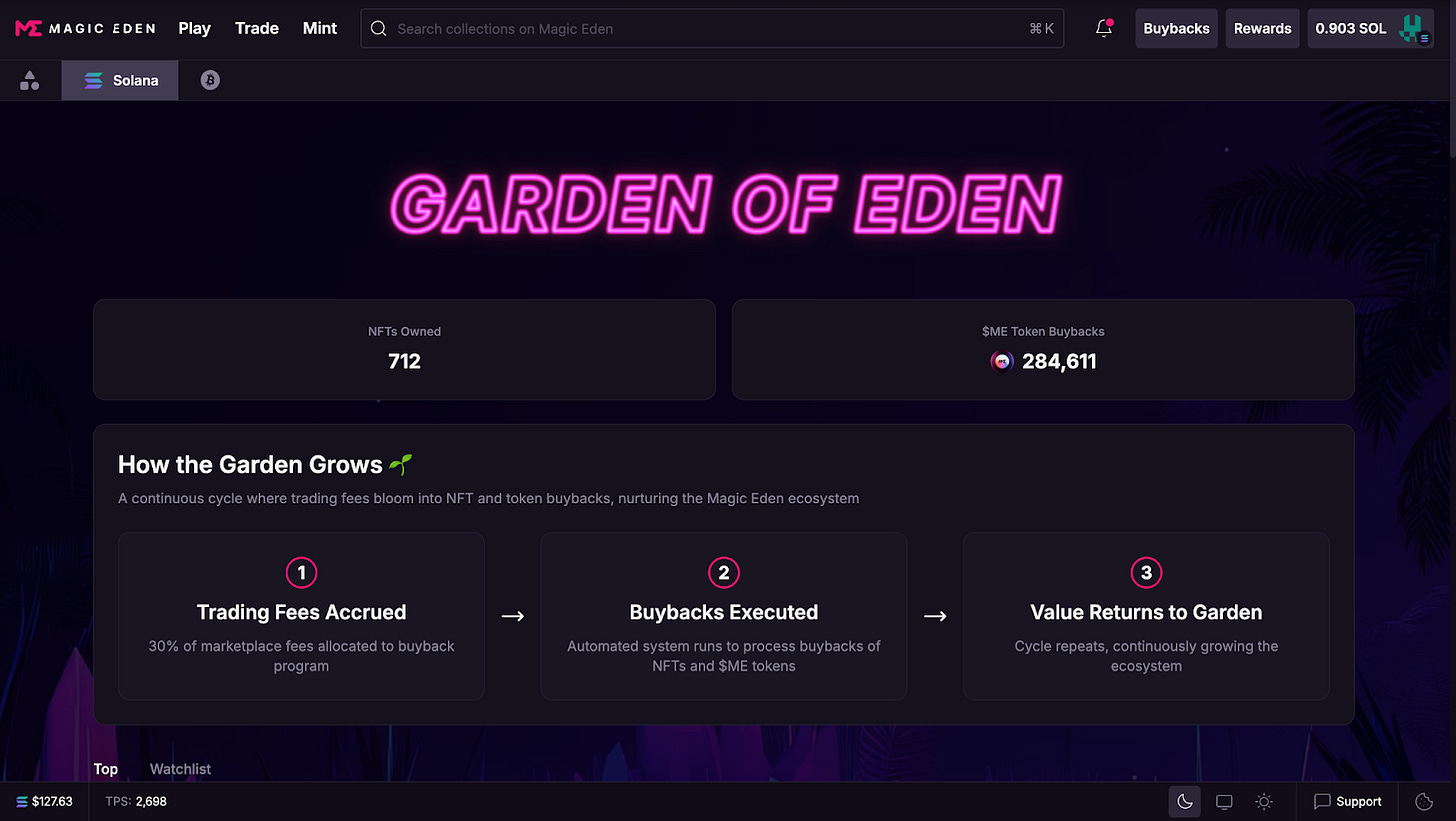 NFT 컬렉션 매입(매출의 15%): 나머지 15%는 플랫폼 내 주요 NFT 컬렉션을 직접 구매하는 데 사용한다. 이렇게 매입한 NFT는 ‘에덴의 정원(The Garden of Eden)’이라는 온체인 저장소에 영구 보관된다. 이는 NFT 시장의 바닥 가격(Floor Price)을 회사가 직접 방어해주어 생태계 전체의 건전성을 높이는 역할을 한다.