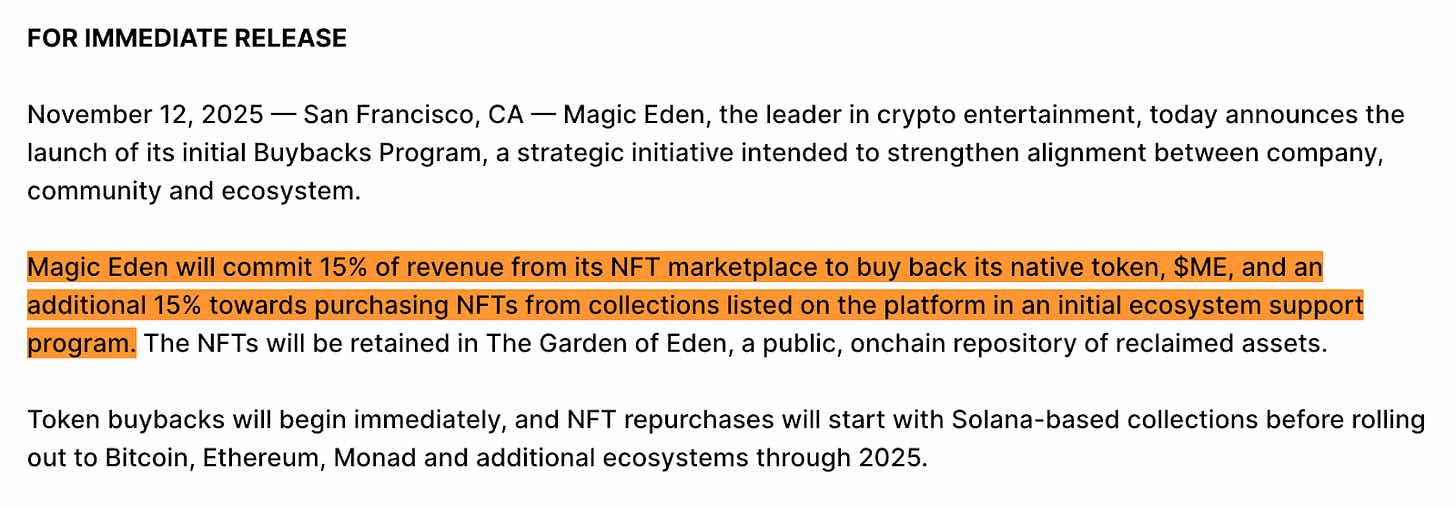 이 프로그램은 솔라나 생태계에서 시작하여 비트코인, 이더리움, 그리고 차세대 체인인 모나드(Monad) 등으로 순차적으로 확대될 예정이다. 결국 매직에덴의 토큰 경제학은 거버넌스(투표권) 기능을 넘어선다. 매직에덴이 잘되면 이 이익이 토큰 매수세와 NFT 가격 방어로 직결되는 구조다.