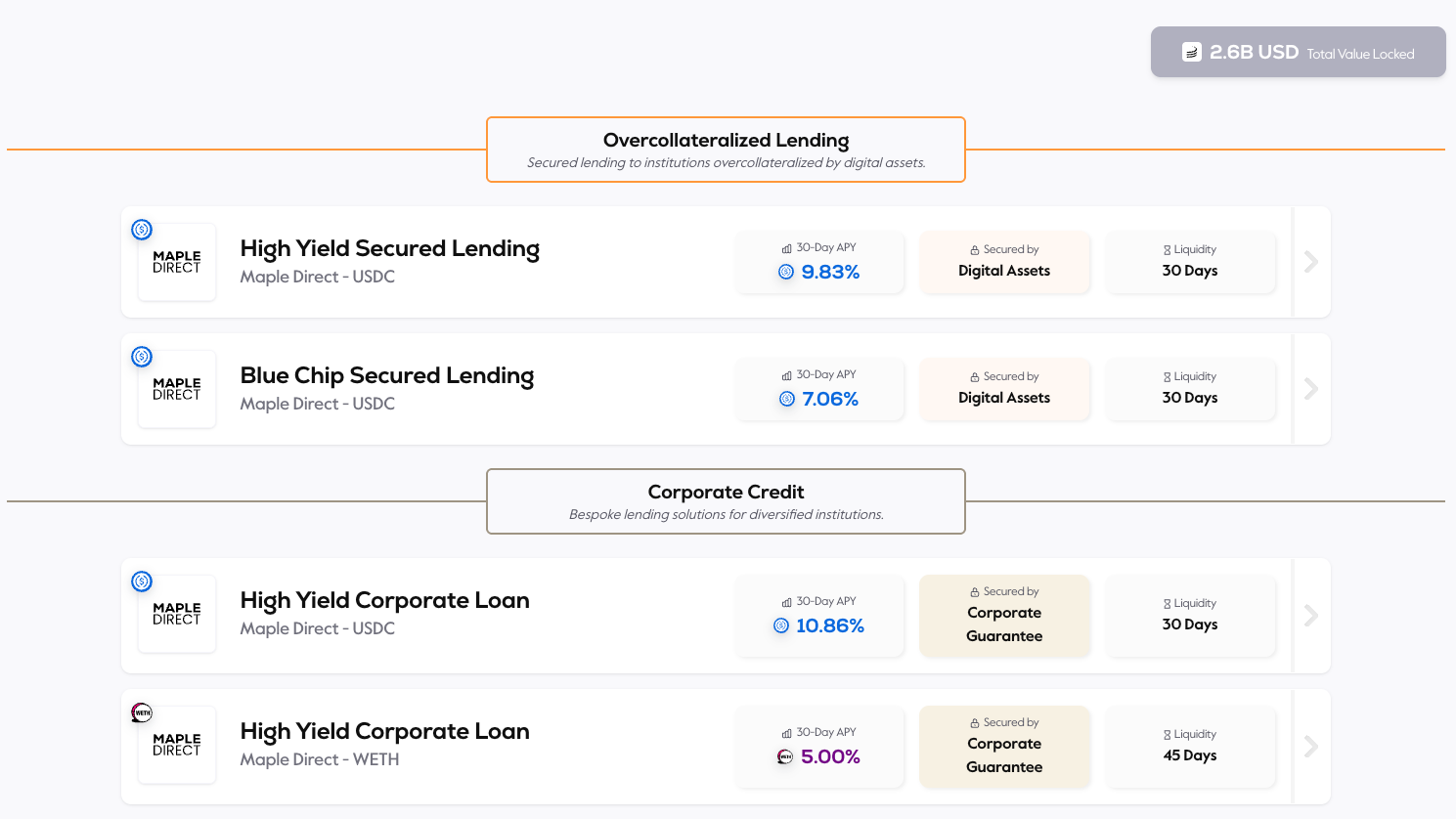 The first category—lending products—includes Maple’s Blue Chip and High Yield offerings. The Blue Chip product line is designed for conservative investors focused on capital preservation. It accepts only established assets like Bitcoin and Ethereum as collateral and follows strict risk management practices.