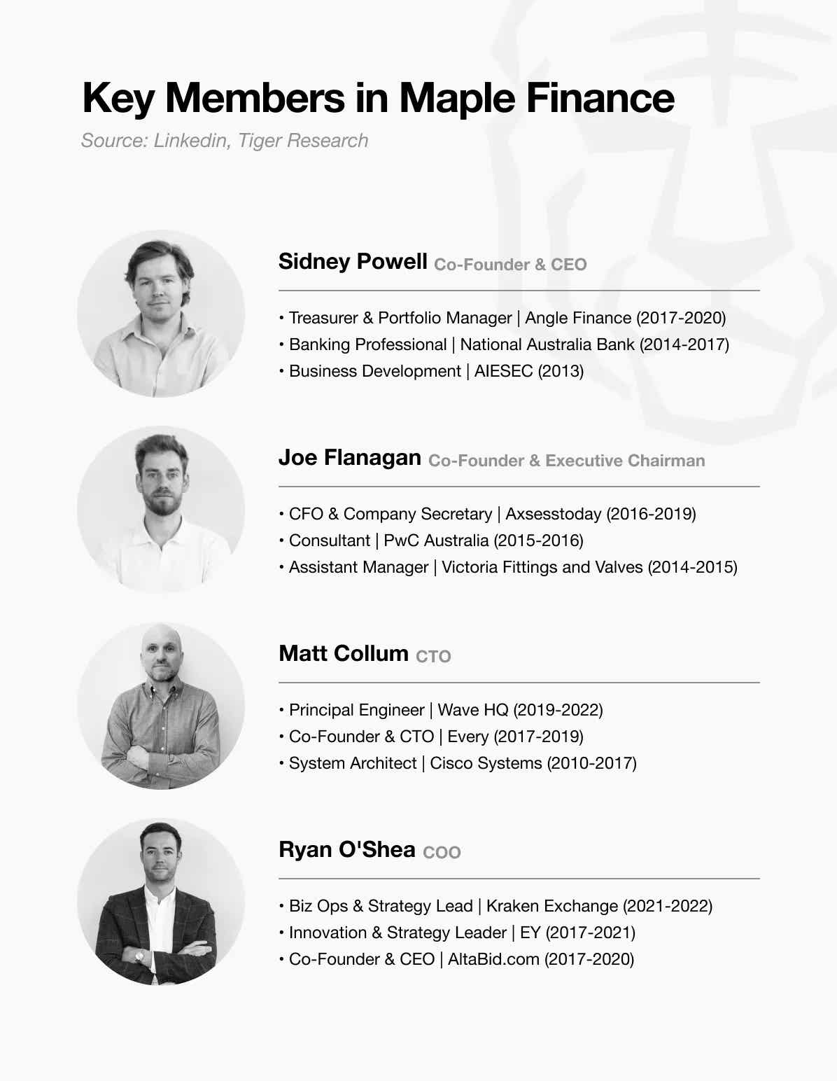 CEO Sidney Powell memiliki pengalaman pengelolaan aset di National Australia Bank dan Angle Finance. Co-founder Joe Flanagan sebelumnya bekerja sebagai konsultan di PwC, secara spesifik pada analisis keuangan korporasi, dan kemudian menjabat sebagai CFO di Axsesstoday.
