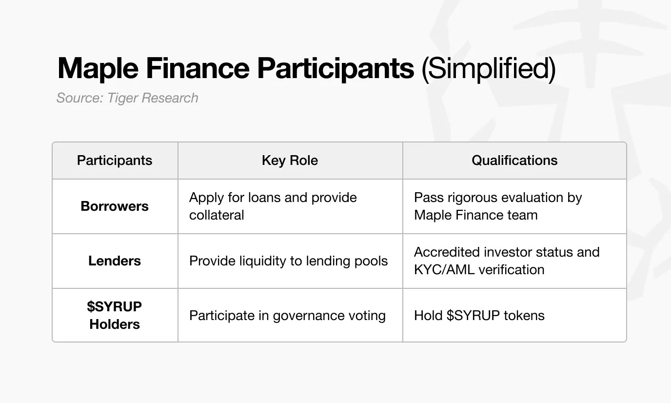 Maple Finance beroperasi dengan cara serupa. Saat peminjam mengajukan pinjaman, tim kredit Maple menentukan syarat berdasarkan rasio jaminan (collateral ratio) dan kualitas aset. Lender berperan layaknya deposan, sementara pemegang $SYRUP memegang fungsi tata kelola serupa dengan pemegang saham, berpartisipasi dalam pengambilan keputusan di tingkat protokol.