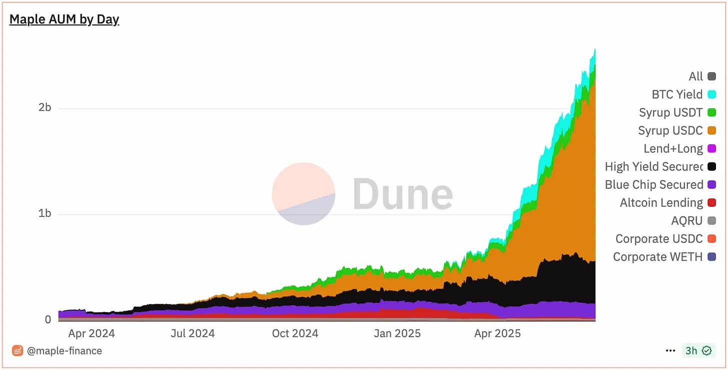 Maple tidak sekadar menghubungkan pemberi pinjaman dan peminjam. Maple juga melakukan penilaian terstruktur terhadap peminjam dan mengelola jaminan (collateral) secara strategis, sehingga fungsinya lebih mirip dengan manajer aset tradisional. Baru-baru ini, Maple memperluas penawarannya dengan produk yield Bitcoin, yang mengubah Bitcoin dari sekadar aset pasif menjadi aset yang menghasilkan imbal hasil.