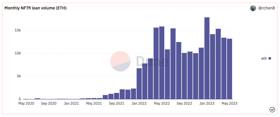 위 차트와 같이 NFTfi 대출 규모는 2022년부터 크게 늘기 시작했으며, 2021년 이후 NFT 거래량이 하락한 것과는 대조적인 모습이다. 판매를 통한 수익 실현이 원활하지 않자 NFT의 유틸리티를 부여해 거래 수익을 보완할 수 있는 NFTfi 시장의 규모가 증가한 것으로 생각된다.