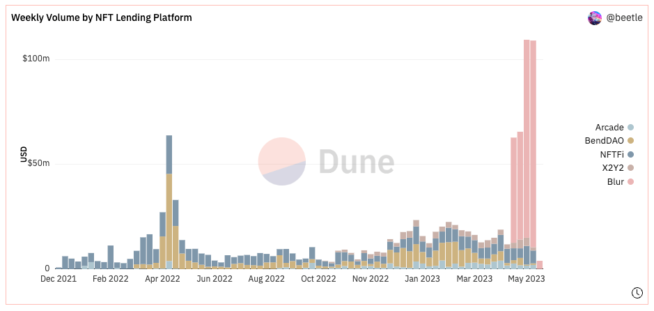 이번 5월 2일 NFT 거래소 Blur에서 플랫폼명인 Blur와 Lending을 합쳐 NFT Lending 서비스 Blend를 선보였다. Blend가 NFTfi와 같은 다른 대출 프로토콜과 다른 점은 Blend 대출 승계자가 없을 때까지 무기한으로 대출이 연장된다는 점이다. 이는 여타 NFTfi 플랫폼과 달리 Blend가 다른 자동으로 해당 대출을 승계하는 대출자를 찾아주기 때문이다. 이 때 더치 옥션을 도입해 유기적으로 대출이 연장될 수 있도록 하고 있다.