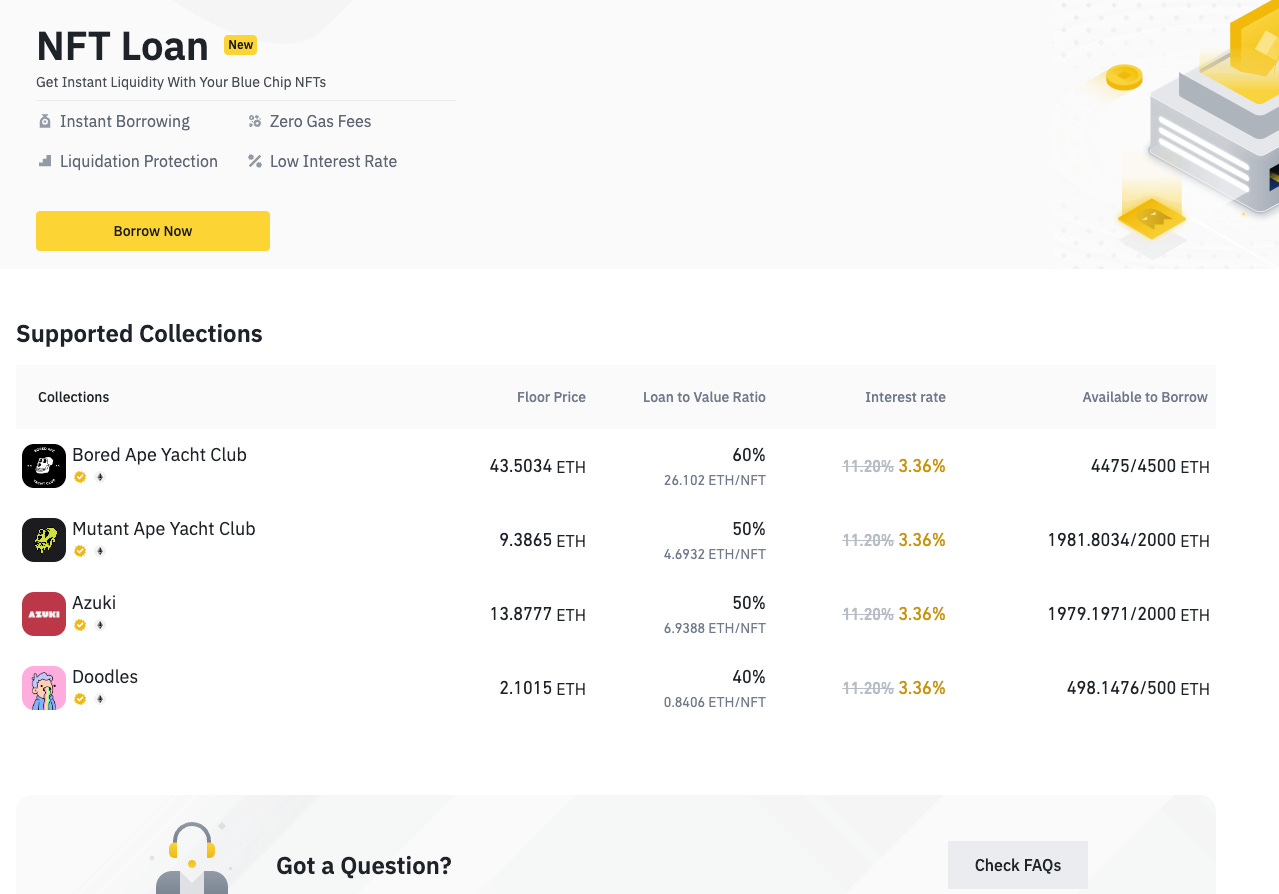 바이낸스 역시 NFT를 담보로하는 대출 서비스를 출시했다. 현재는 BAYC, MAYC, Azuki, Doodles 등 블루칩 NFT를 담보로 대출을 지원하고 있다. P2P 구조가 아닌 P2Pool 방식으로 바이낸스가 대출풀 역할을 수행하는 구조이다. 현재는 단 네가지의 블루칩 NFT만을 지원하고 있지만 바이낸스에서 이번 5월에 비트코인 NFT 지원을 곧 추가할 것이라고 발표한 것으로 보아 비트코인 NFT도 추가될 수 있을 것으로 보인다.
