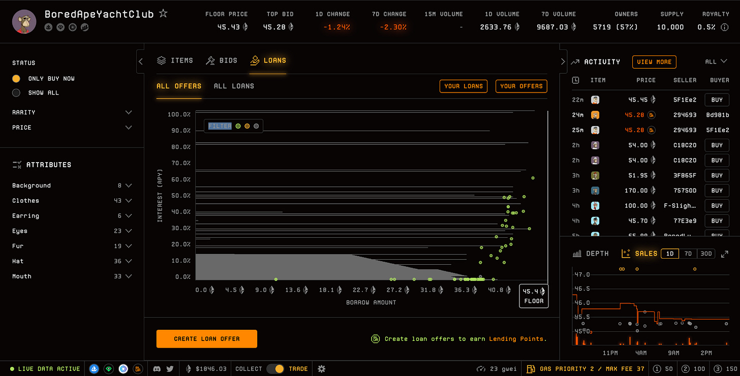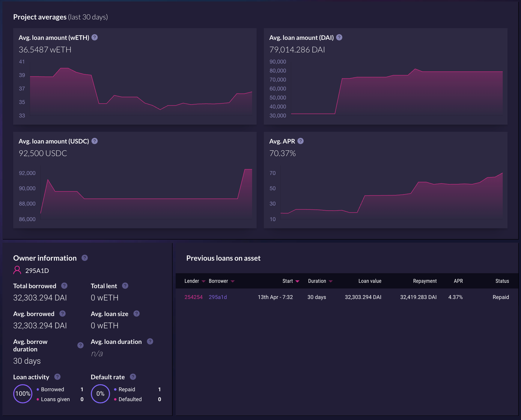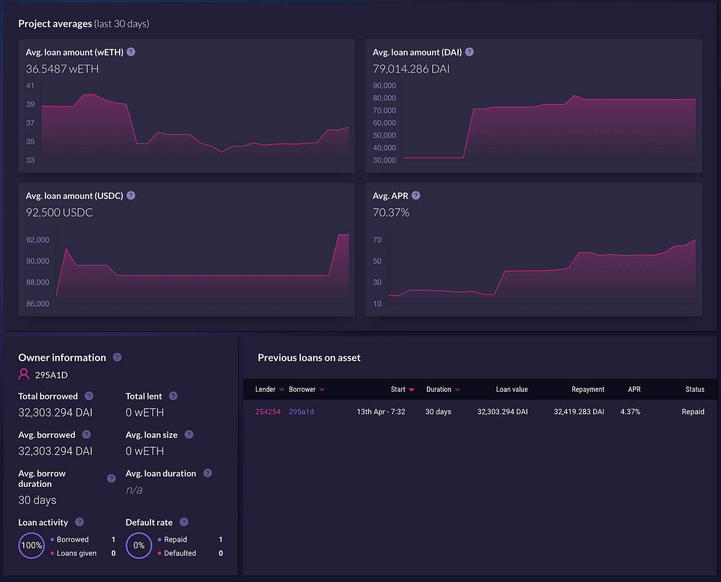 NFTfi는 NFT 담보 대출의 대표적인 서비스로 현재까지 $420M 이상의 대출이 실행된 플랫폼이다. 앞서 설명한 방식과 같이 차입자가 NFT를 리스팅하면 이를 확인한 대출자가 대출 조건을 제시하는 방식으로 차입자와 대출자의 합리적인 선택을 위해 해당 프로젝트의 평균 대출 금액 APR, 그리고 해당 NFT에서 이뤄진 대출 이력을 보여줘 합리적인 선택이 가능하다. 또한 담보물의 신뢰성을 보장하기 위해 NFTfi DAO를 통해 화이트리스팅 작업을 진행하여 대출을 받을 수 있는 프로젝트를 검증하고 있다.