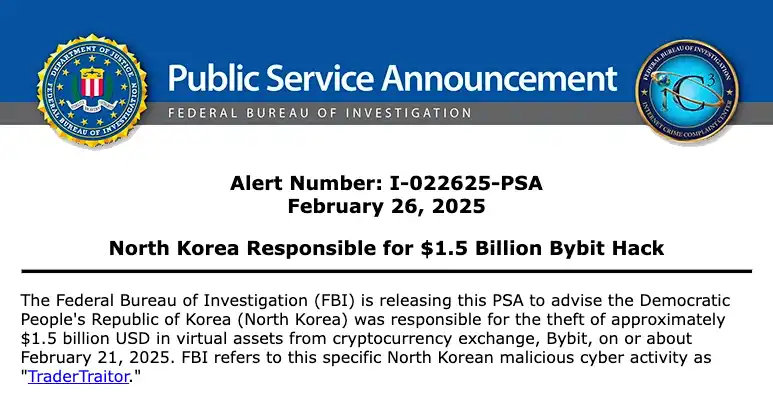 On February 26, 2025, the Federal Bureau of Investigation (FBI) announced that a North Korean hacking group was responsible for the theft of approximately $1.5 billion in cryptocurrency assets from Bybit.