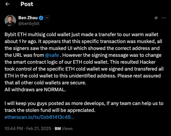 As concerns spread, users began withdrawing funds en masse, creating a scenario comparable to a bank run. In response, Bybit CEO Ben Zhou issued a public statement assuring that the exchange remained solvent and that all customer assets were fully backed at a 1:1 ratio.