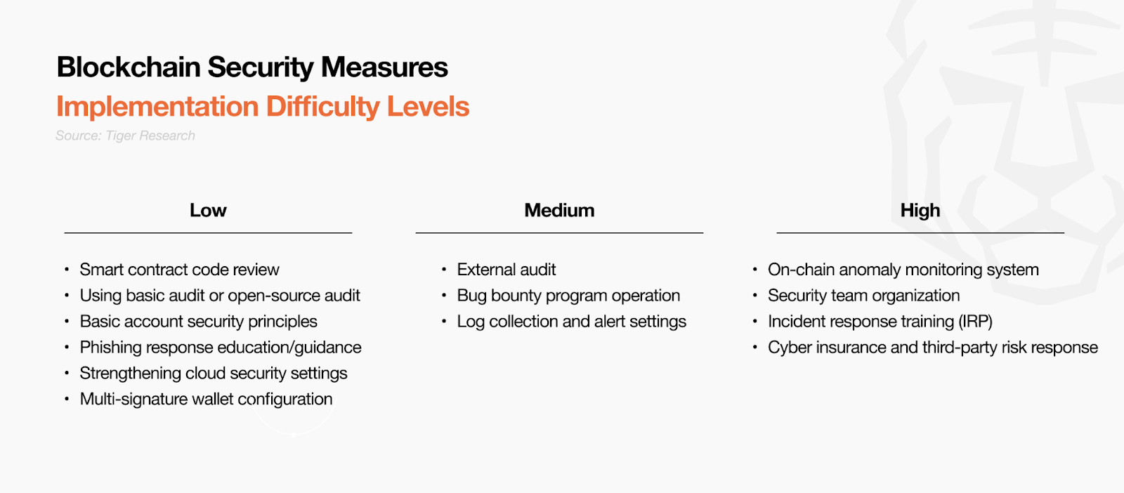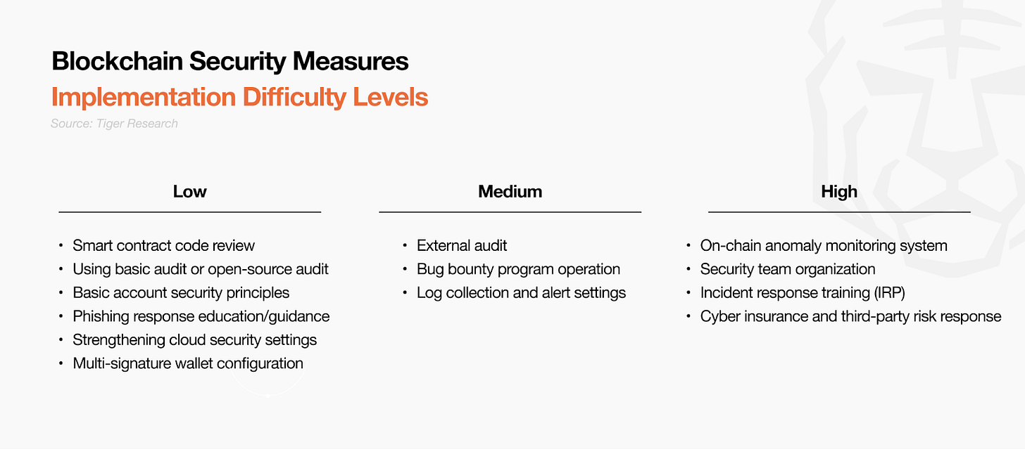 이러한 사회공학적 위협에 대응하기 위해서는 기술적 방어체계 구축만으로는 충분하지 않다. 스마트 컨트랙트 코드 무결성 확보와 함께 팀원과 사용자 대상 보안 인식 교육, 피싱 대응 훈련, 다중 인증 체계가 더욱 중요해졌다. 특히 온체인 이상 탐지나 보안팀 구성 같은 고난이도 보안 항목은 기술적 방어를 넘어 사회공학적 공격 대응 능력 강화에 초점을 맞춰야 한다.