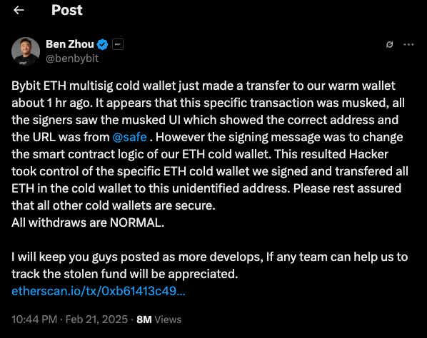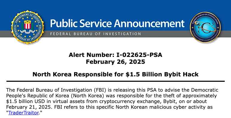 미국 연방수사국(FBI)이 2025년 2월 26일 발표에 따르면, 북한의 해킹 그룹이 약 15억 달러의 암호화폐 자산을 바이빗에서 탈취한 것으로 밝혀졌다.
