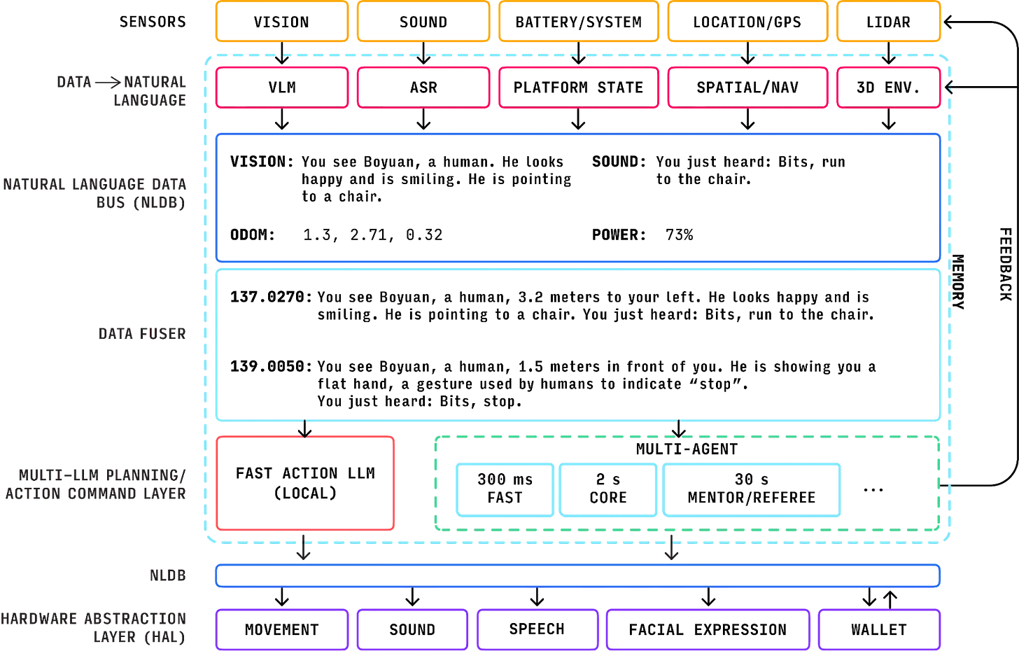 Kalimat-kalimat ini dikumpulkan melalui Natural Language Data Bus. Data kemudian disatukan oleh Data Fuser menjadi laporan situasi dan dikirim ke beberapa LLM. LLM menganalisis laporan tersebut dan menentukan tindakan berikutnya untuk robot.