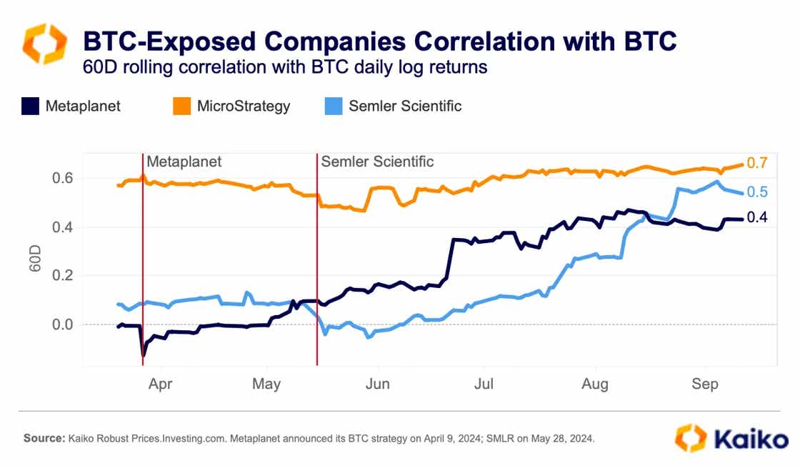 이들의 발표 이후, BTC와 이들 기업 주가 간의 상관관계가 증가했습니다. 메타플래닛의 상관관계는 0.4로, 셈러는 0.5로 상승하였습니다. 하지만 두 기업 모두 마이크로스트레트지의 0.7보다는 여전히 낮은 수준입니다.