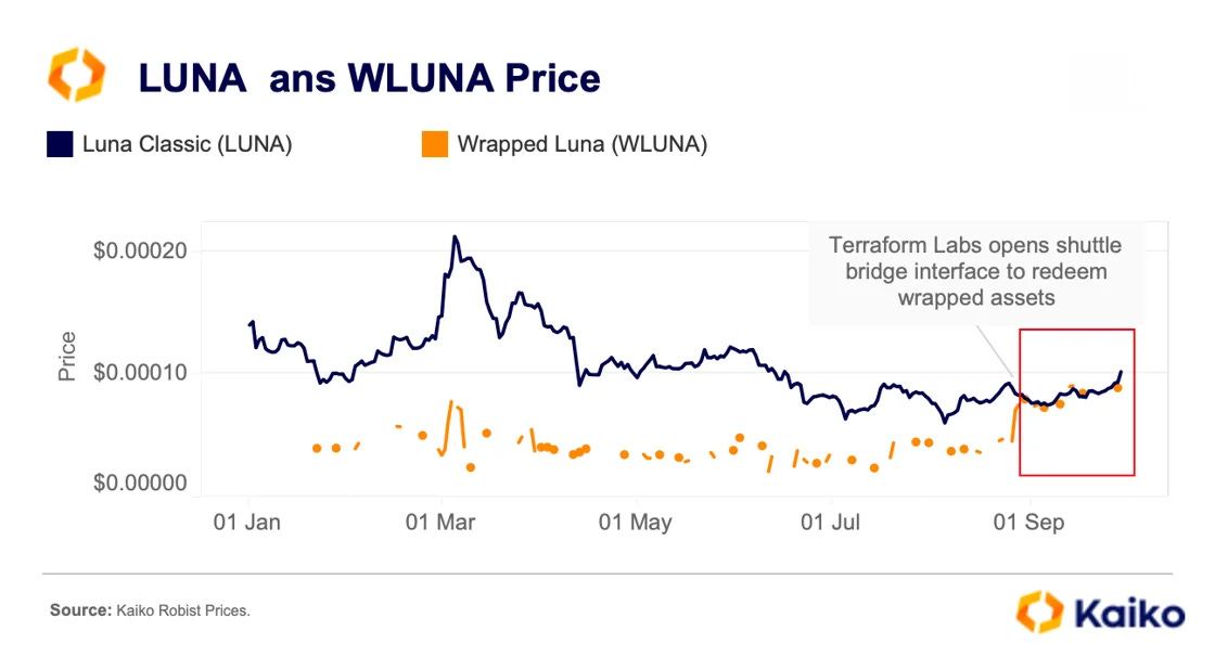 현재는 붕괴되어 사라진 테라 생태계의 네이티브 토큰인 루나 클래식과 그 랩드(Wrapped) 버전인 WLUNA의 가격이 지난 한 달 동안 수렴했습니다. 8월 28일 테라폼 랩스가 루나 클래식과 WLUNA 간의 스왑을 용이하게 도와주는 셔틀 브리지 인터페이스를 오픈한 후, 트레이더들은 두 토큰 간의 가격 차이를 이용해 차익거래를 할 수 있게 되었습니다.