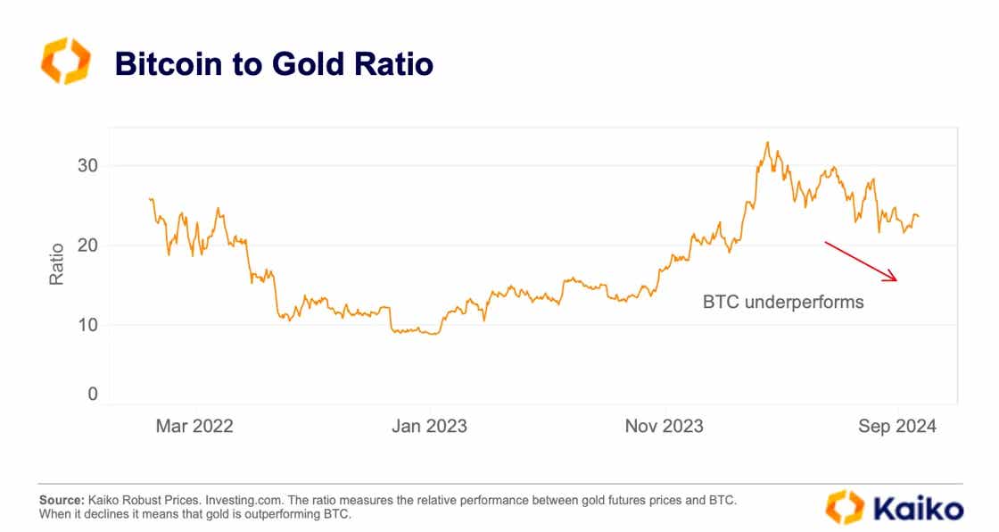 최근 몇 달 동안 비트코인은 금에 비해 저조한 성과를 보였으며, 8월 매도세 동안 위험 자산과 유사한 흐름을 보였습니다. BTC와 금의 비율은 3월에 1 BTC당 33 온스였으며 지난주에는 24온스로 하락했습니다.