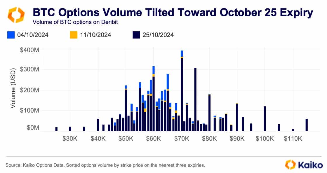 10월의 세 만기일을 살펴보면, 대부분의 거래량이 월말에 만기되는 BTC 옵션에 집중되어 있음을 알 수 있습니다. 일반적으로는 가장 이른 시기에 만료되는 계약에 더 많은 거래량과 유동성을 가집니다.