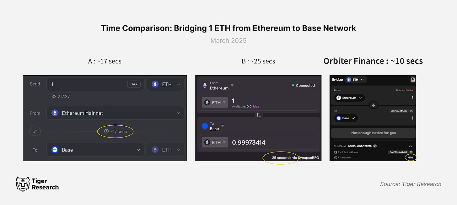 In addition to speed, Orbiter Finance demonstrates strong fee efficiency, particularly for L2 transfers. By minimizing smart contract calls, the platform reduces gas consumption for ETH bridging to approximately 21,000 gas, significantly lower than competing bridges which consume 120,000 to 450,000 gas per transaction. However, while Orbiter Finance generally maintains a cost advantage, its fee structure is not uniformly superior across all routes. In certain market conditions and specific transfer paths, its fees may be higher than those of competitors.