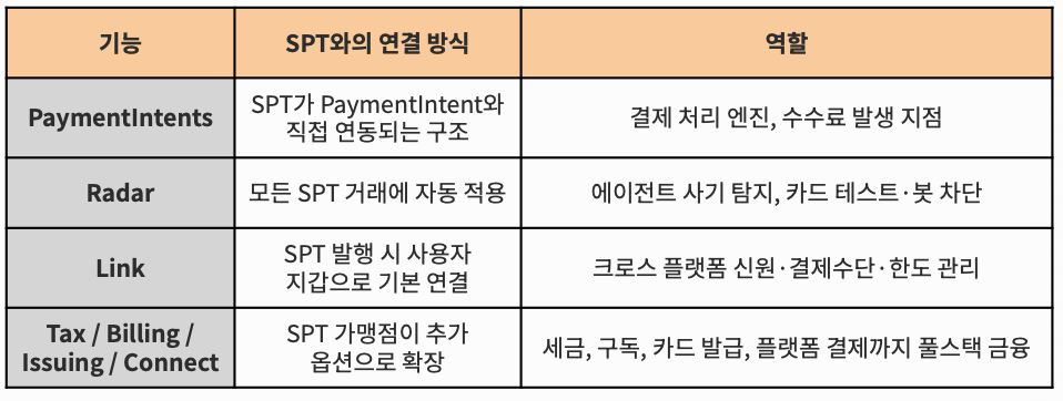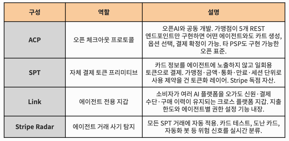 네 구성의 공통점은 ACP만 오픈 표준이고 나머지는 모두 스트라이프 자사의 기술이다. ACP가 ‘에이전트와 가맹점이 어떻게 대화하는가’를 다루는 공용어라면, SPT는 그 대화 안에서 실제 돈이 어떻게 흐르는가를 담당하는 스트라이프 고유의 결제 토큰이다.