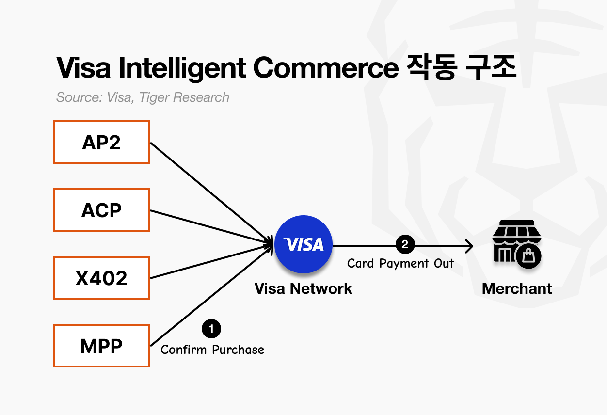 이전 비자는 자체 Trusted Agent Protocol과 Intelligent Commerce로 독자 생태계를 구축하려 했다. “우리 표준 써라”의 접근이었다. 그런데 MPP 출시와 동시에 비자가 카드 레일 확장 파트너로 합류했다. Cuy Sheffield(비자 Crypto 수장)는 “MPP를 에이전트와 판매자 간 커뮤니케이션 방식이 명확하게 정의된 또 다른 방법으로 본다”고 발언했다. 이 한 문장은 비자가 크립토 네이티브 표준에 맞서기보다 그 안에 카드 레일을 심는 방식으로 전략을 바꿨다는 신호다.
