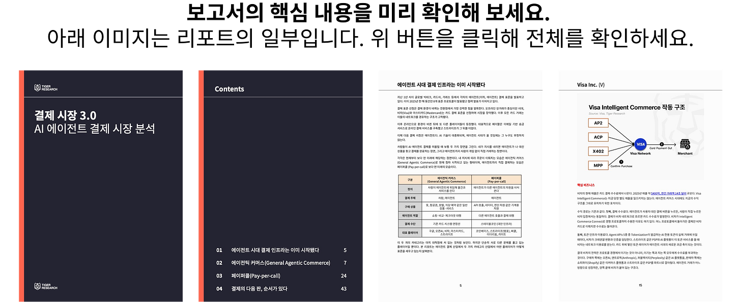 다만 한 가지 스테이블코인이라는 변수가 있다. 에이전트 간 결제가 비자 네트워크를 아예 지나지 않고 블록체인 위에서 직접 정산되면, 비자는 수수료를 가져올 레이어 자체가 사라진다. 비자가 Bridge와 스테이블코인 카드를 만들고 스테이블코인 전용 체인 템포(템포)의 밸리데이터로 참여한 것도 이 리스크에 대한 대응이다.
