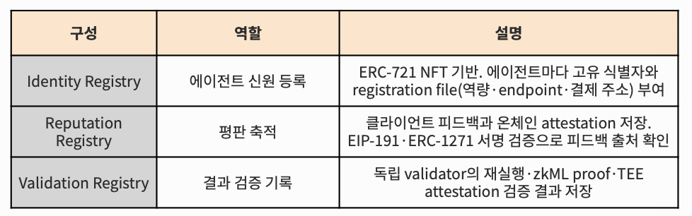 ERC-8004의 구조는 세 개의 온체인 레지스트리로 이루어져 있다.