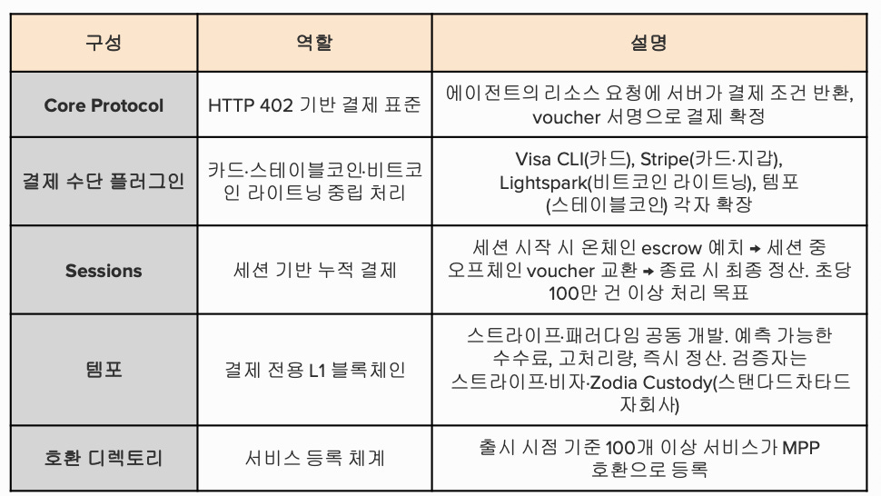 템포의 초기 디자인 파트너 명단을 보면 이 시장의 성격이 드러난다. 앤스로픽, 오픈AI, 도이체방크, 비자가 들어와 있다. MPP 자체의 확장 구현은 비자(카드), 스트라이프(카드·지갑), 라이트스파크(라이트닝)가 있다.