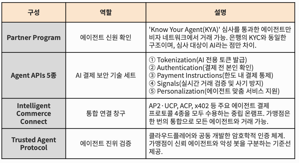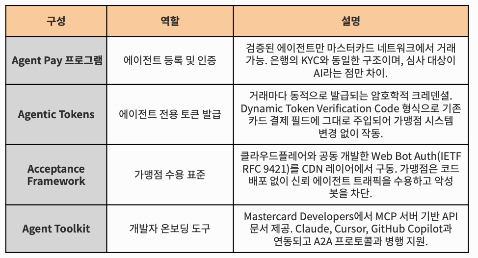 2025년 4월 Mastercard Agent Pay를 런칭했고, 9월에 개발자 도구를, 10월에 Agent Pay 수용 프레임워크(Acceptance Framework)를 공개하면서 에이전트 결제 시스템을 단단히 구축하고 있다.