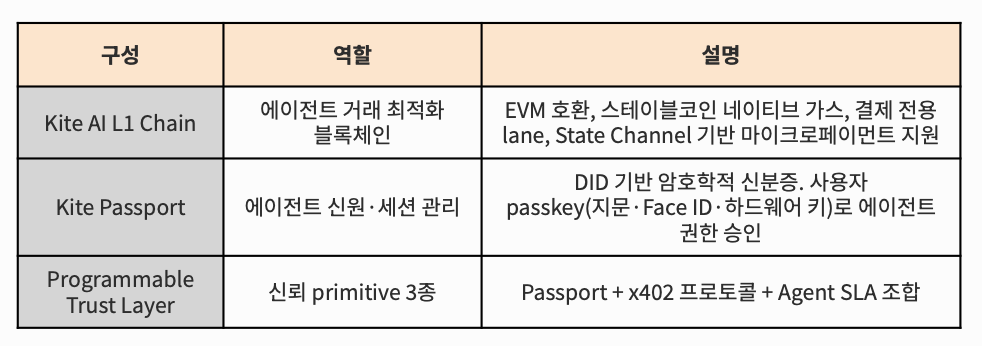 핵심은 네 가지다. EVM 호환 L1 체인(스테이블코인 네이티브 정산), Kite Passport(에이전트 신원·위임 관리), Programmable Trust Layer(암호학적 지출 규칙), SLA 컨트랙트(서비스 보증 자동 집행). 이 네 가지가 분리된 제품이 아니라 하나의 스택으로 작동한다는 게 다른 플레이어들과 구조적으로 다른 지점이다.