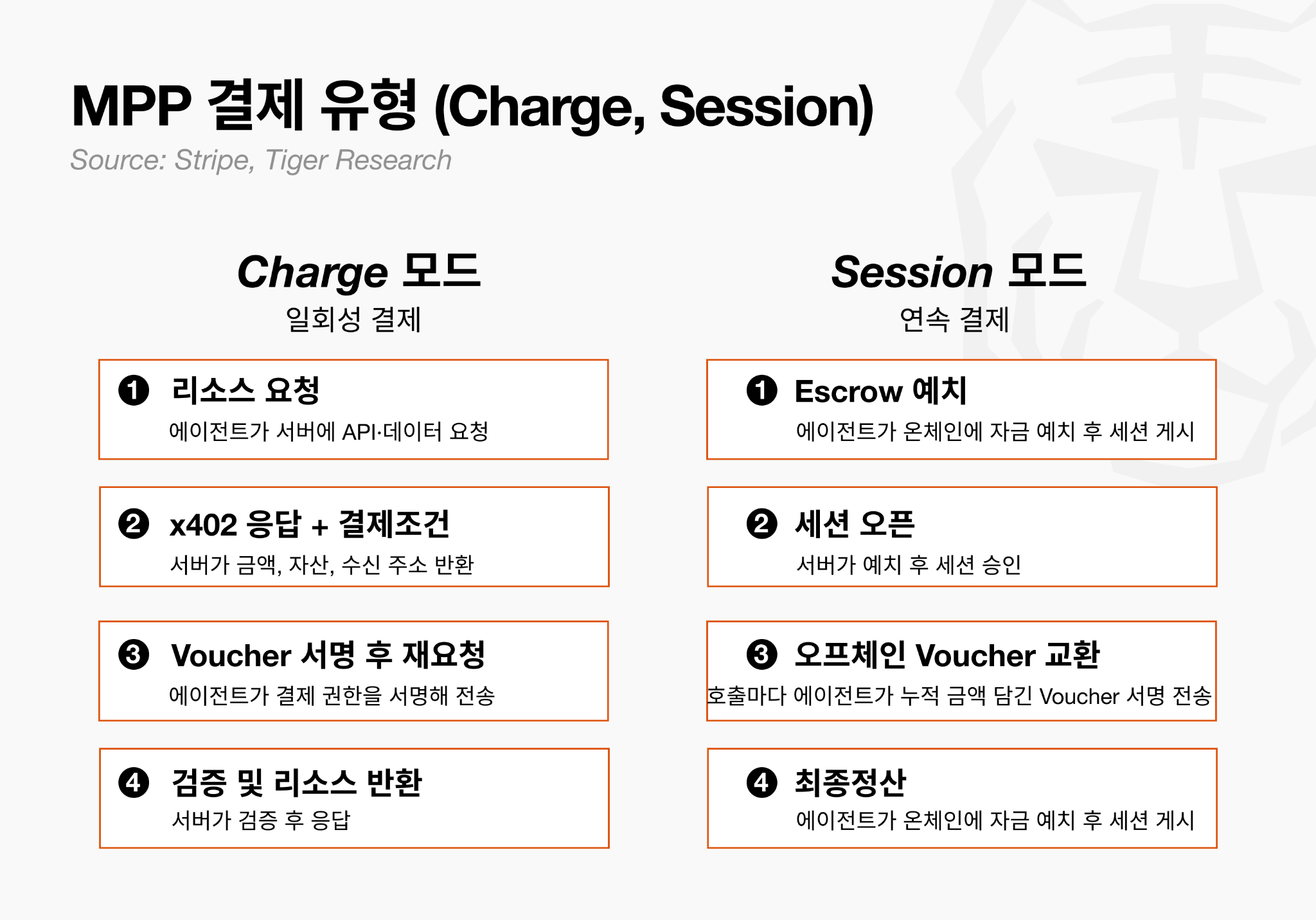 프로세스 시각화에서 두 모드가 극명하게 대비된다. 일회성 결제(Charge)는 온체인 트랜잭션 1건으로 완결되는 x402와 유사한 흐름이고, 연속 결제(Session)는 처음 예치와 마지막 정산 두 번만 온체인에 기록하며 그 사이 N번의 호출은 전부 오프체인에서 voucher로 처리된다.
