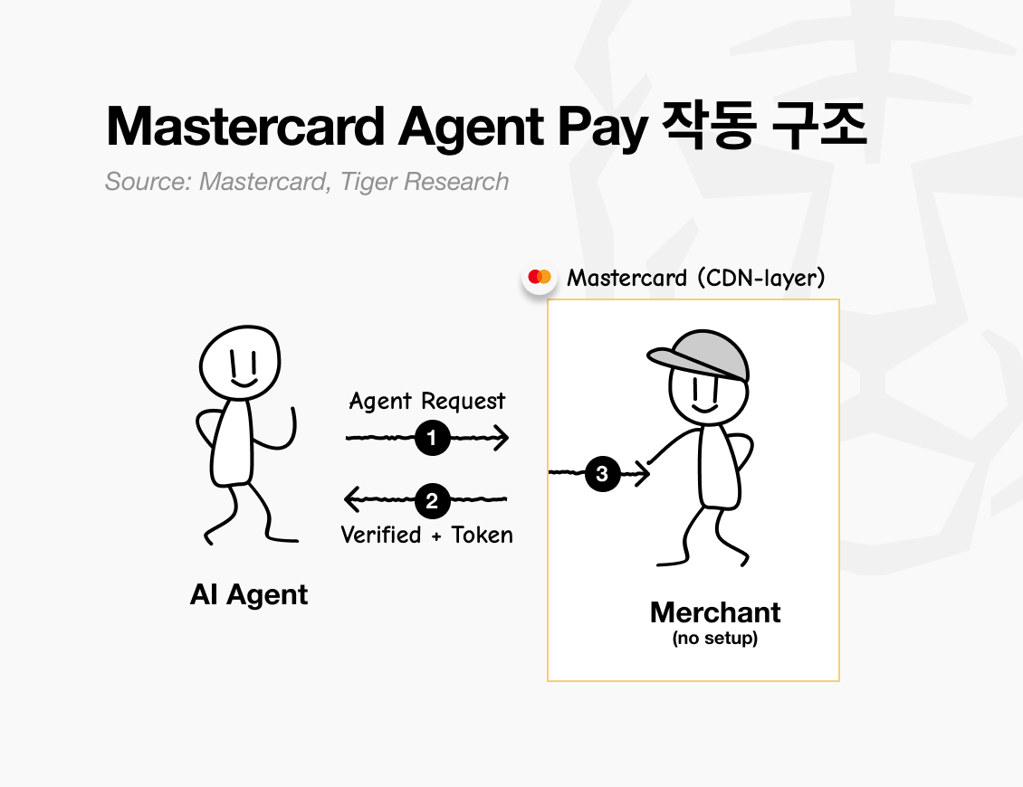 문제는 에이전트 결제가 카드 네트워크를 아예 우회할 수 있다는 점이다. 스테이블코인으로 온체인에서 직접 정산되면 마스터카드가 낄 자리가 없다. 에이전트 페이(Agent Pay)는 이 구멍을 막기 위한 전략이다.