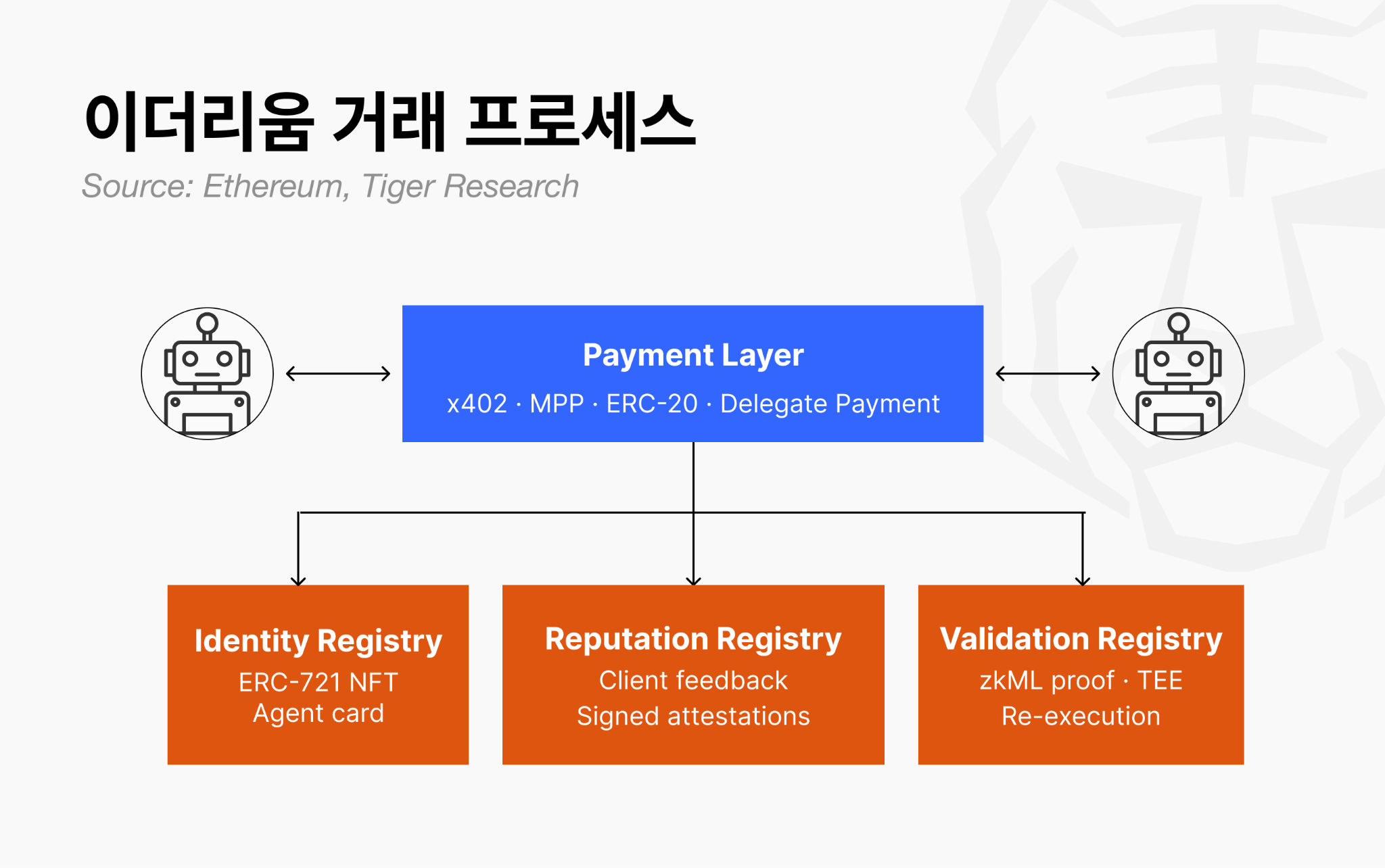 이 선택의 의미는 명확하다. 이더리움은 결제 프로토콜 경쟁에 뛰어들지 않았다. x402도, MPP도, 위임결제(Delegate Payment)도 모두 결제 “행위” 자체를 다룬다. 이더리움은 결제 위에 쌓이는 “누가 거래했고, 결과가 어땠는가” 를 표준화하는 쪽을 택했다.