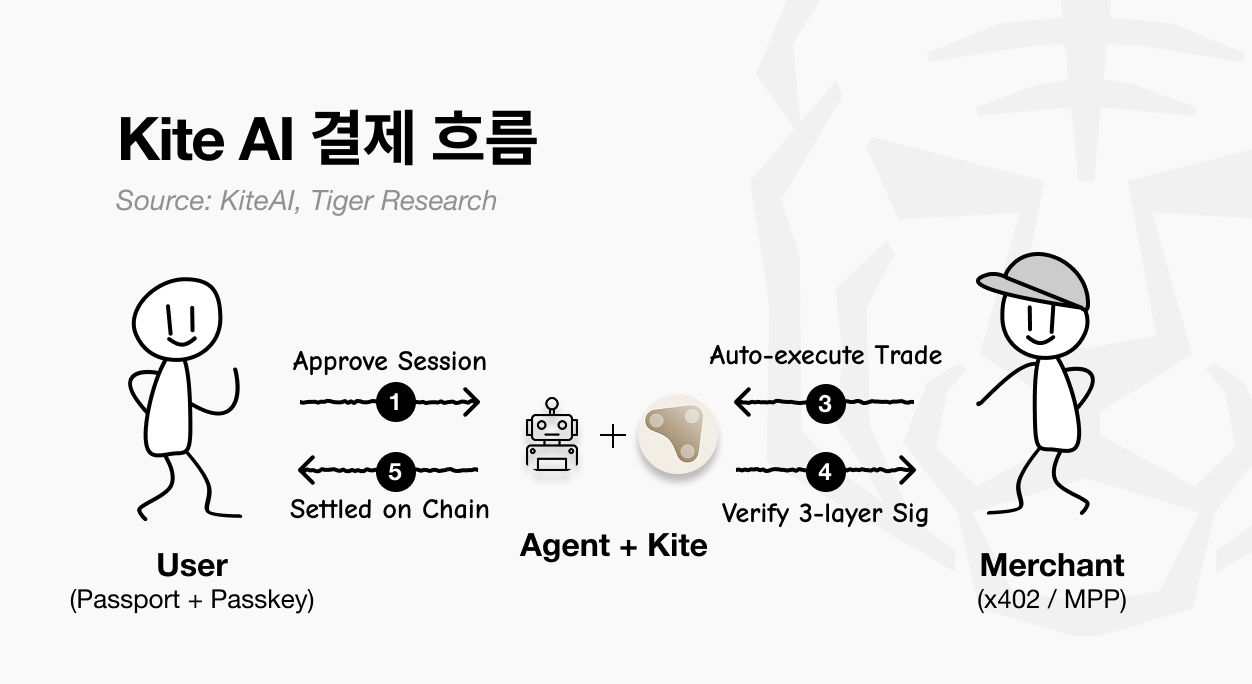 카이트(Kite AI)는 AI 에이전트를 위해 처음부터 설계된 전용 결제 인프라다. 비자·마스터카드·스트라이프가 기존 카드 결제망이나 PSP 인프라를 에이전트 환경에 이식하는 방식이라면, Kite는 반대 방향에서 출발한다. 에이전트가 자율적으로 결제하는 환경을 전제로 체인·신원·세션·평판을 하나의 스택으로 묶었다.