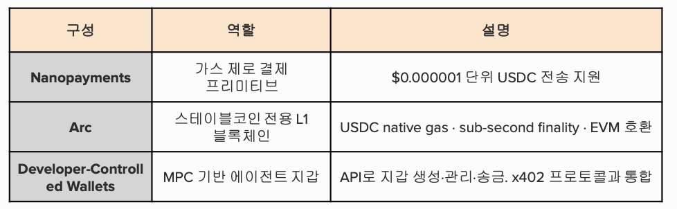 2025년 9월 Developer-Controlled Wallets와 x402 통합 샘플을 공개했고, 2026년 3월 나노결제(Nanopayments) 테스트넷을 가동했으며, 같은 시기 아크 퍼블릭 테스트넷도 운영 중이다. 서클의 페이퍼콜스택은 세 가지 구성으로 이루어져 있다.