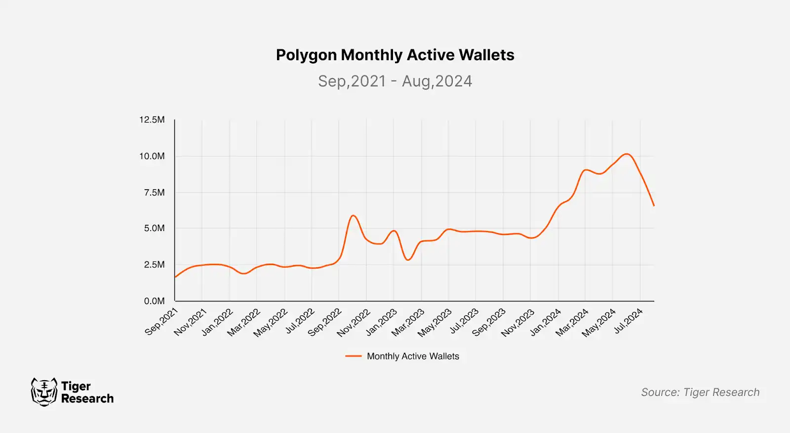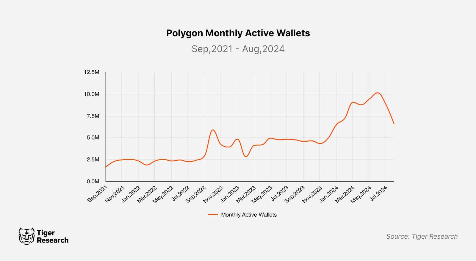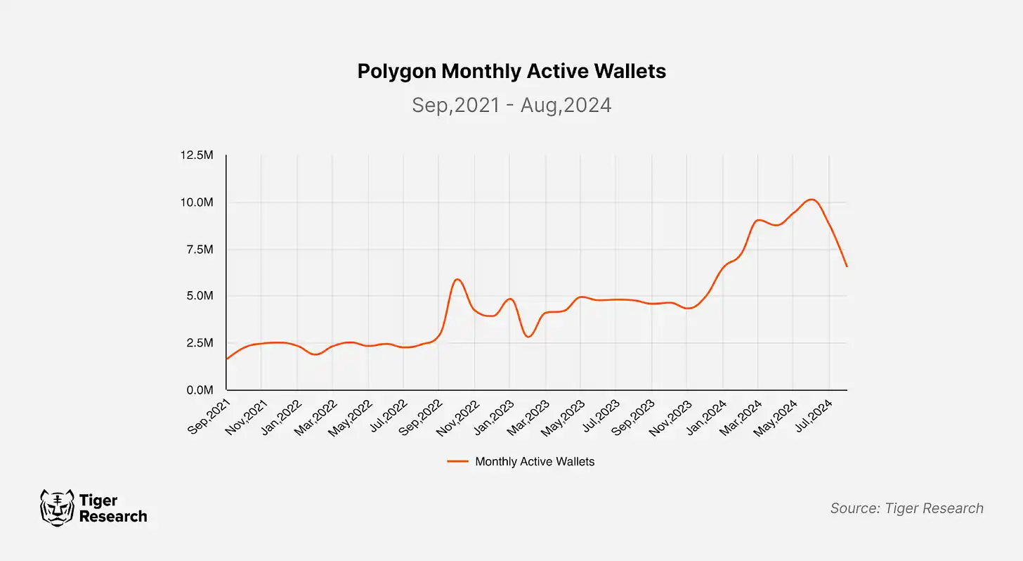 Polygon protocols have maintained a strong presence in the market with a consistent performance. Since 2021, the number of monthly active wallets on the Polygon PoS network has steadily increased and transaction volumes have shown signs of recovery. Despite these positive indicators, the perception regarding Polygon is that "Polygon is back". This notion can largely be attributed to a shift in market attention toward new chains, airdrops, and staking in the latter half of 2023, coupled with prevailing misconceptions about Polygon’s position in the market.