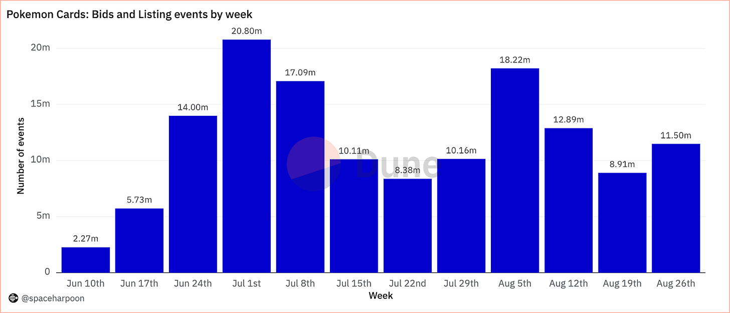 Courtyard, another Polygon PoS-based dApp, offers the NFTization of physical trading cards and has facilitated over 480,000 real-world transactions. Weekly bids and listings for tokenized Pokémon cards have reached 200,000. These are numbers that show the popularity of the platform’s ability to bridge the digital and physical worlds. This connection between digital assets and traditional card trading demonstrates a compelling real-world use case for blockchain technology and speaks to its practical value beyond speculative markets.