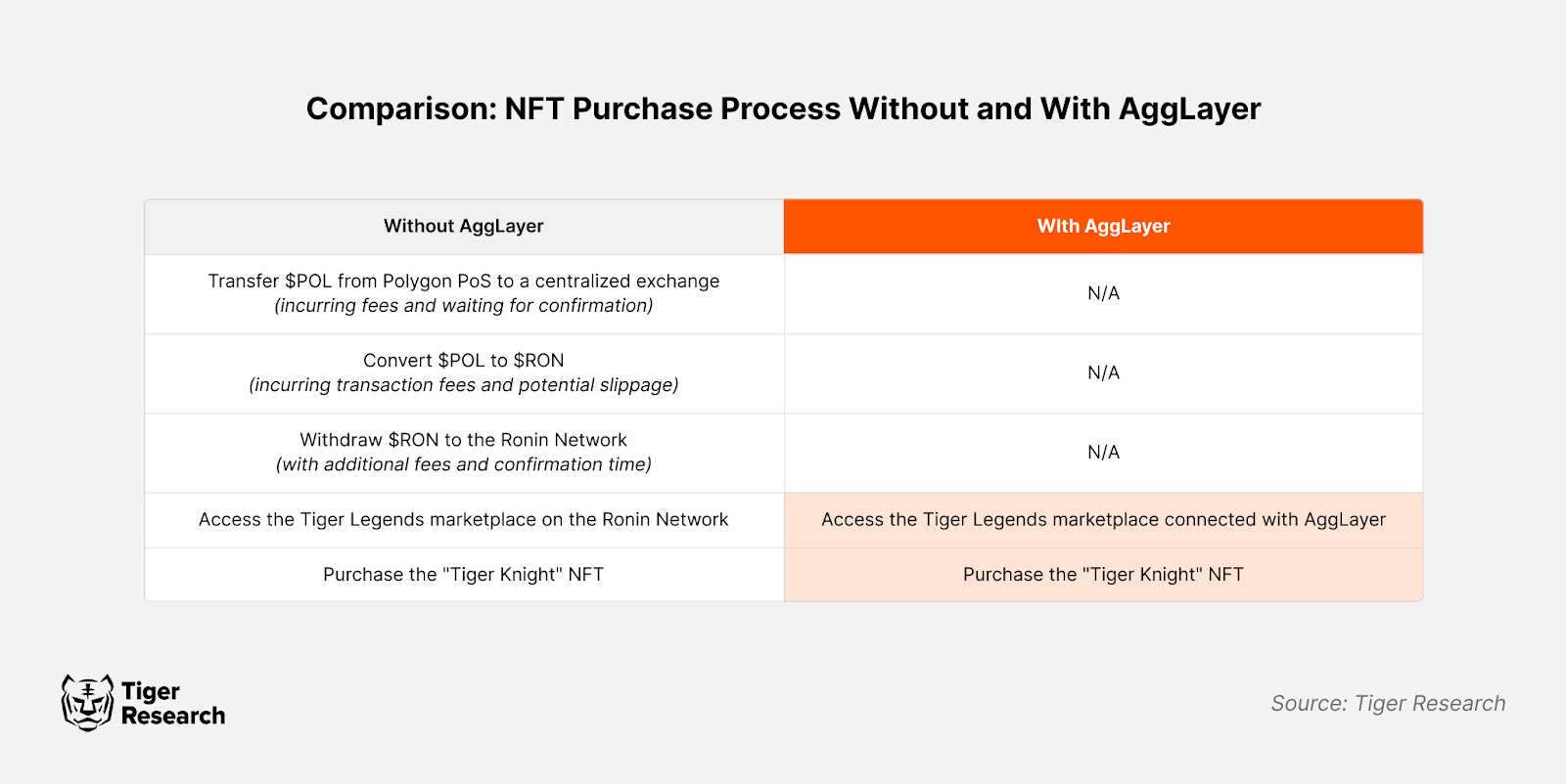 To better understand how the AggLayer aims to simplify blockchain interactions, consider the following example scenario involving a Web3 gamer. The player learns about a new NFT game called ‘Tiger Legends’ on the Ronin zkEVM L2, powered by Polygon CDK, where players can collect and breed rare tiger character NFTs. A particular NFT, the "Tiger Knight," catches the gamer's attention. It is priced at 500 $RON. However, the gamer's assets only consist of $POL tokens on the Polygon PoS.