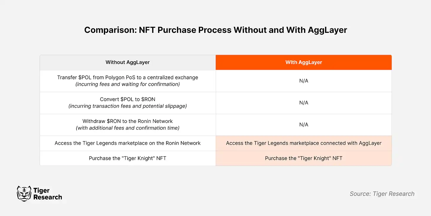 Each of these steps introduces time delays, costs, and potential security risks. With the AggLayer, the entire process could be simplified into a single transaction: