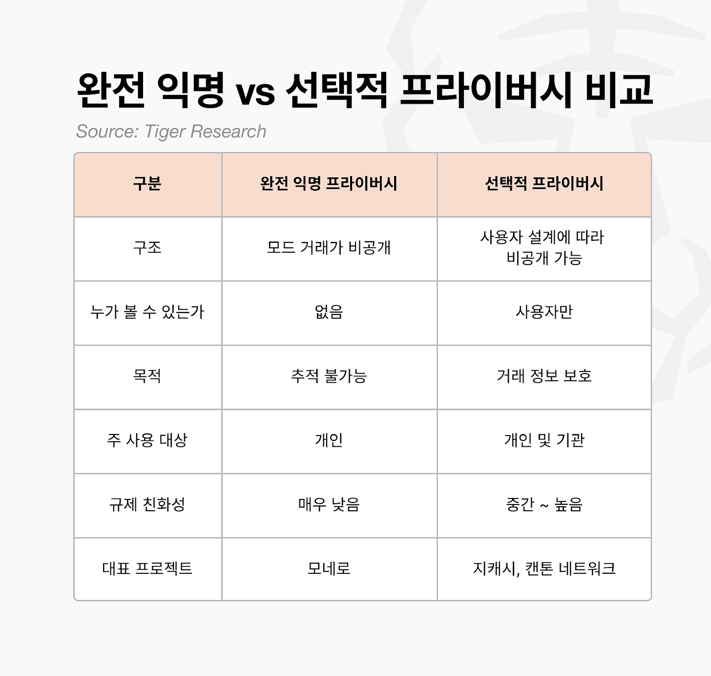 모네로와 같은 ‘완전 익명 프라이버시’는 규제 대응(KYC/AML)이 불가능하여 제도권 금융기관이 채택하기 부적합