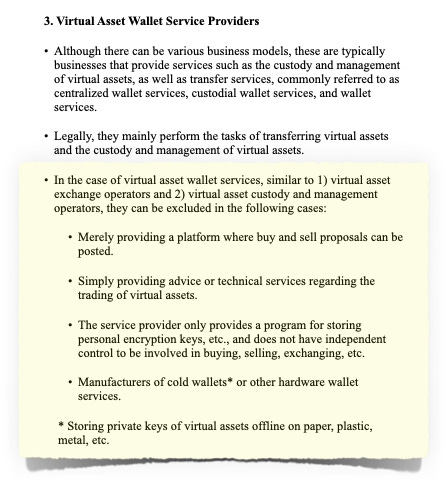 The South Korean regulatory body considers "cryptocurrency wallet service providers" as a whole to fall within the scope of virtual asset service providers (VASP). This suggests that wallet services also fall within the regulatory umbrella.