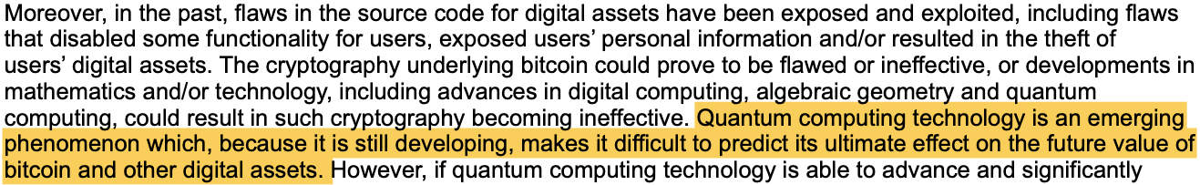 Q-Day 情景,即量子计算机能够攻破区块链密码学的情景,估计将在 5 到 7 年内到来。贝莱德在其比特币 ETF 申请文件中也指出了这一风险。