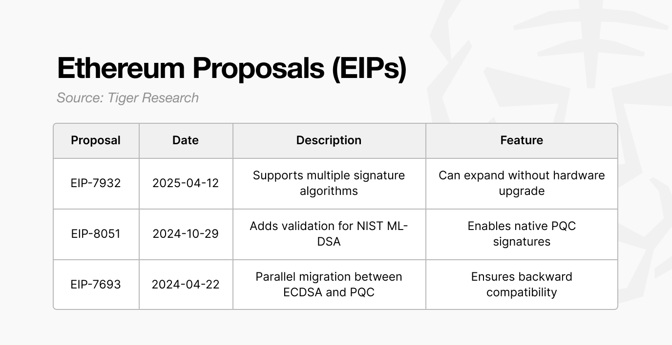 EIP-7693: Introduces a hybrid migration path that maintains compatibility with ECDSA while enabling gradual transition to PQC signatures.