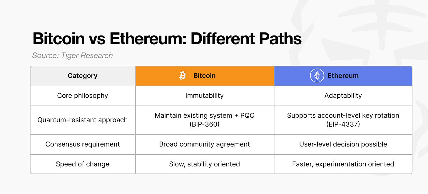In summary, Bitcoin aims to preserve its current structure while integrating PQC in parallel, whereas Ethereum is redesigning its account model to absorb PQC directly. Both pursue the same goal of quantum resistance, but Bitcoin relies on conservative evolution while Ethereum adopts structural innovation.