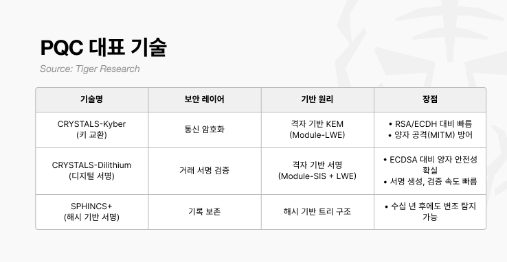 결국 PQC 기술은 양자 컴퓨터 공격에 대응하기 위해 1 BTC 전송 과정에서 통신 암호화(Kyber), 서명 검증(Dilithium), 기록 보존(SPHINCS+)이라는세 가지 보안 계층을 구축한다.